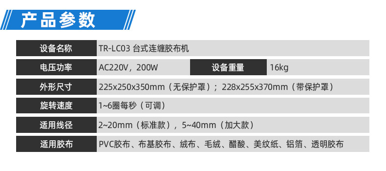 适用胶布:PVC 胶布、布基胶布、绒布、毛绒、醋酸、美纹纸、铝箔、透明胶布